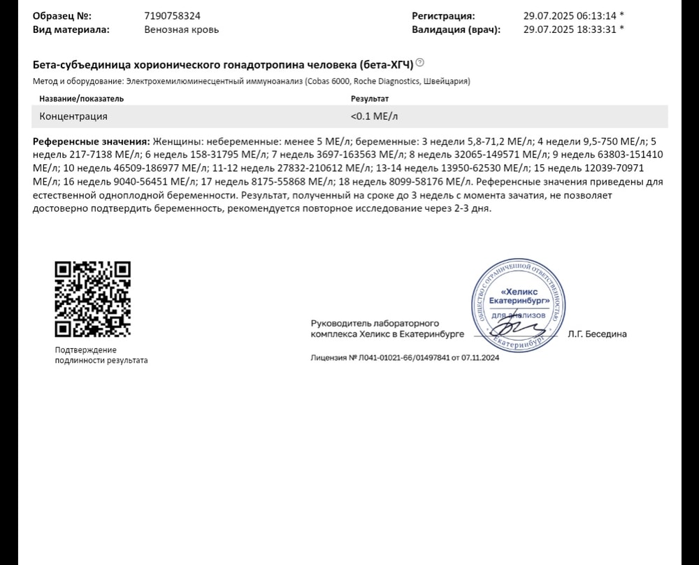 Добрый день, задержка менструации 6 день. Предыдущие были 24.06 , до этого назначали панцеф, к нему ещё принимала пребиотик Синобактин. Приём препаратов пришёлся на пару дней начала менструации и в итоге она шла дней 13-14 я подумала что может из за препарата. Сейчас 30.07 менструации до сих пор нет. После 24.07 когда должны были начатся, грудь набухла чуть болезнена ( до этого перед менструацие никогда не болела) тянуло чуть низ живота. По утрам последнии 2 дня как будто подташнивает. Тесты на каждый день задержки одна полоска, вчера сдала Хгч <0.1