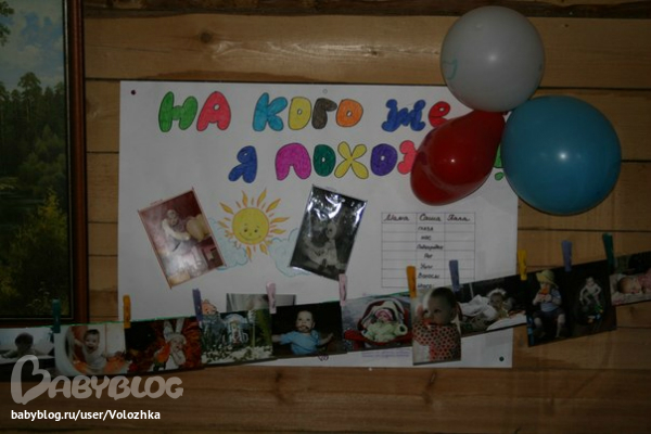 Празднование было намечено на 15.00, после дневного сна именинницы. Не буду подробно описывать этапы приготовления и всю суету на кухне, думаю это каждому понятно. Дом украсили множеством надувных шариков, растяжек поздравительных, сама сделала плакат "Накого же я похожа?", украсила все гирляндой из Сашиных фотографий, которые в конце вечера были расхватаны родственниками "на память", был сделан паровозик из 12 вагонов (был конкурс - его собирали все родственники и торжественно водружали на стену).
