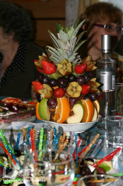 На столе было много канапе, рулетиков из лаваша с ветчиной, 3 салата (шуба, с курицей и с сухариками и овощами), нарезка из сыров,мяса и бутерброды с икрой. На горячее конечно же шашлык! :) Еще сделала фруктовый букет (см.фото). На десерт были куплены пироги в "Пироговом дворике"