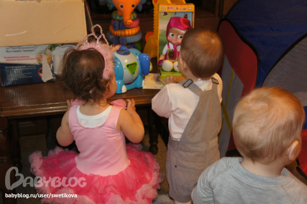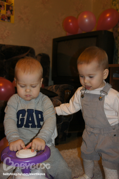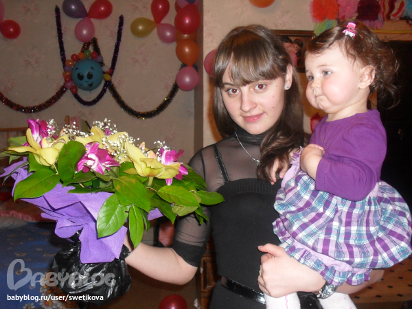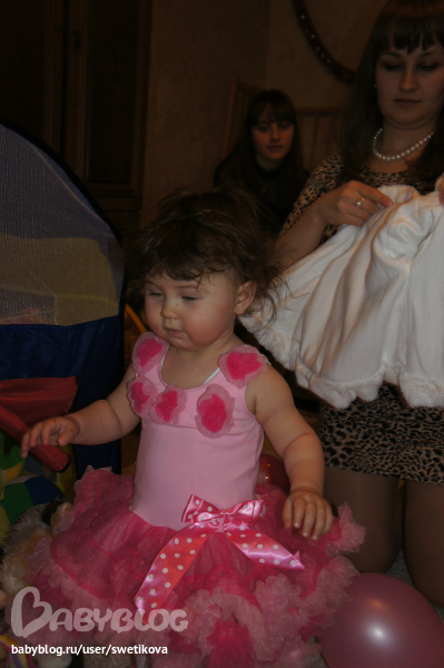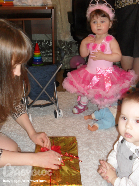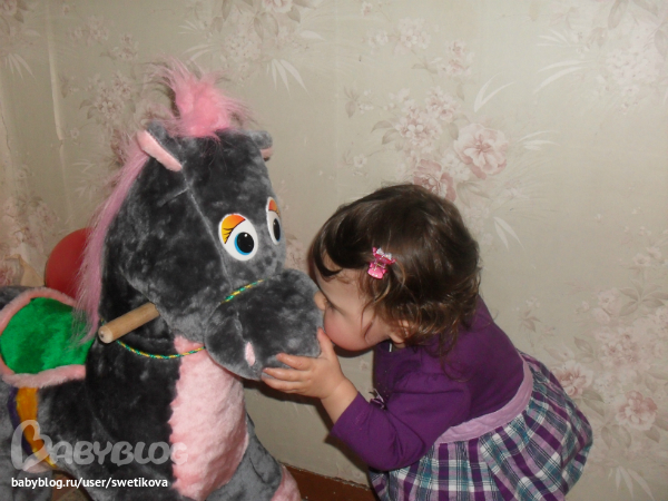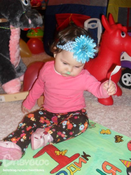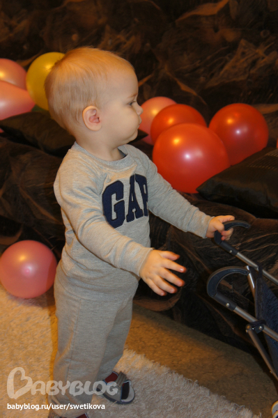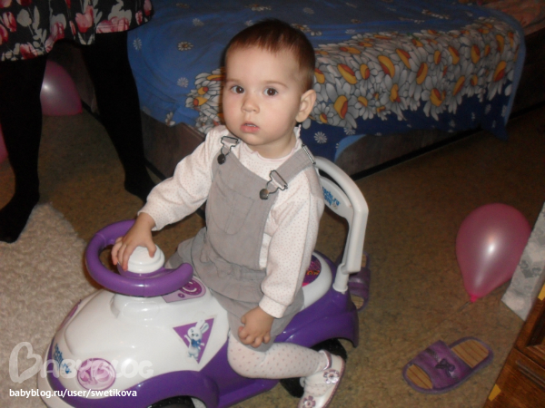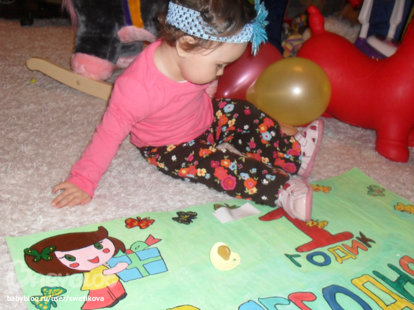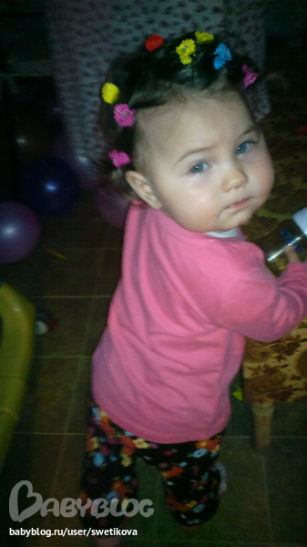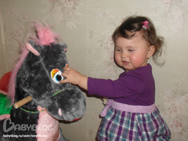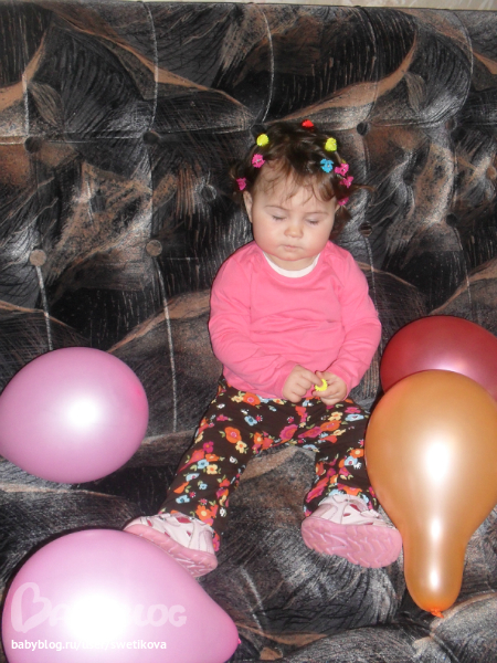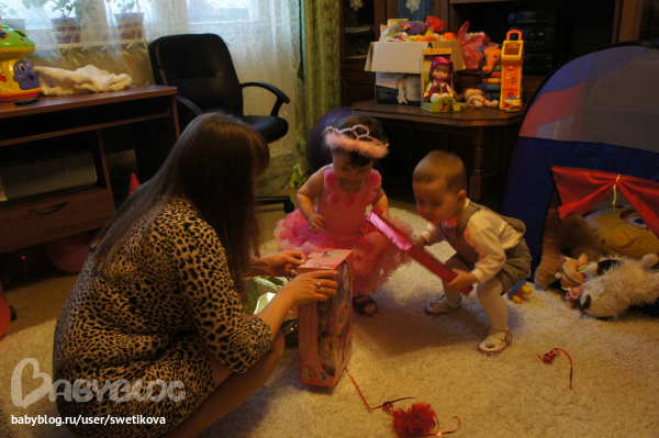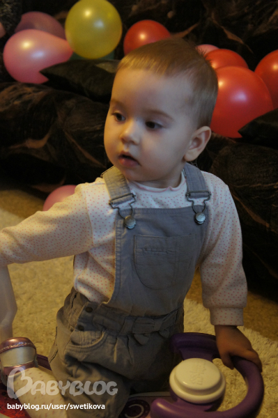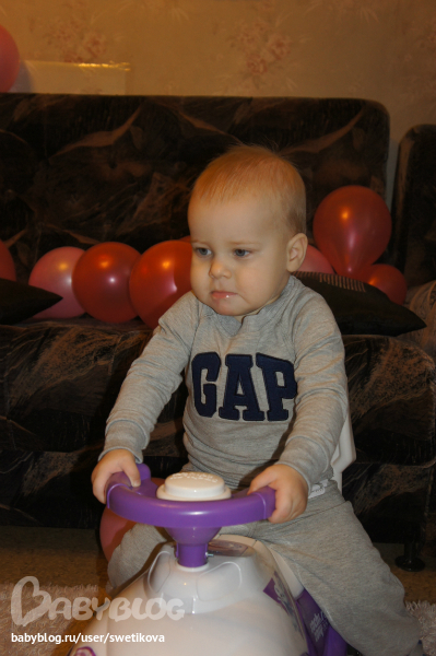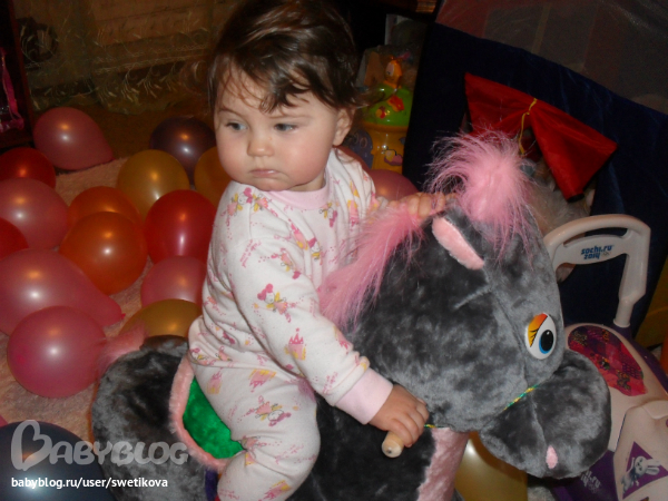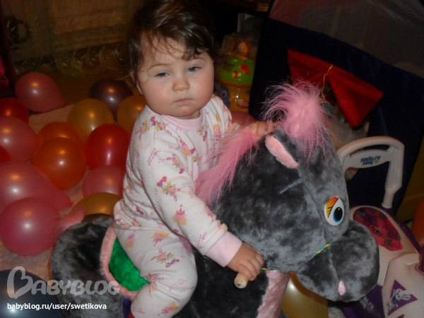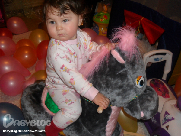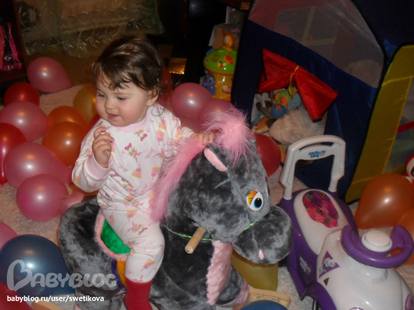Годик нам был еще 28 декабря.Утром я проснулась пораньше,что бы закидеть комнату шариками и поставить в середину комнаты подарки)))проснувшись Злата не совсем поняла в чем дело,но лошадка качалка ей понравилась.отметили др хорошо,в обед приходили Зтатика подружка Алисуня и друг Кирюха со своими мамами.Вечером пожаловали бабушка с дедушкой.