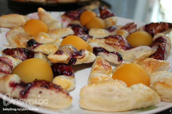 в перый день на столе был торт собственного приготовления и слоеные пирожки, с яблоком и абрикосами.