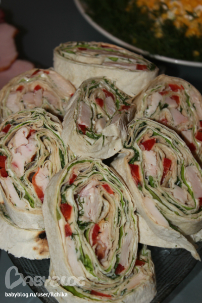 рулетик из лаваша с копч. курицей, зеленым салатом, паприкой и сыром плавленым.