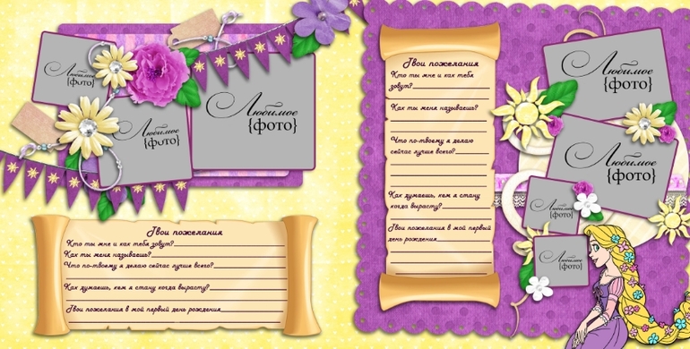 Предлагаю свои услуги!А у меня появился новый макет фотокниги пожеланий "Рапунцель")). Спасибо Ксении за такой интересный заказ для маленькой Аленки))) Покажу несколько разворотов и обложку))