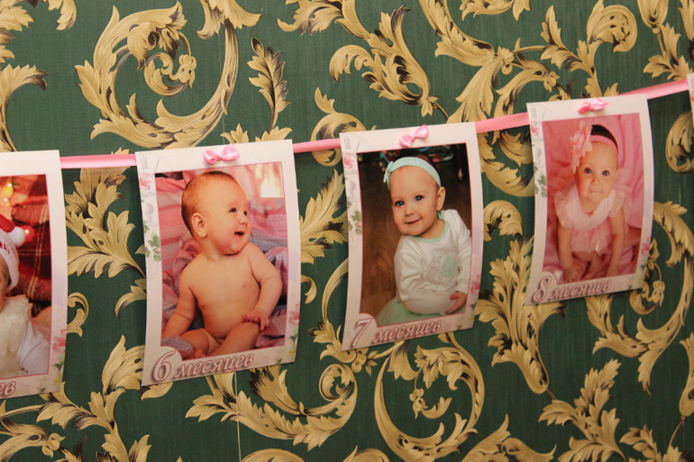 Вот такая гирлянда украшала стену над столом. Все фото, кроме 0 месяцев делала я, можно наблюдать мой прогресс как новоявленного "фотографа"