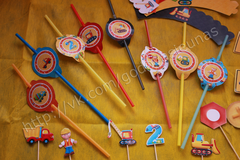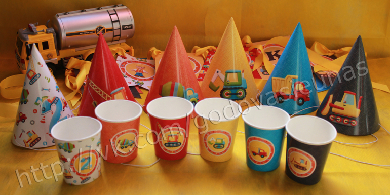 Чтобы привнести дух стройки Вашей вечеринке, подготовьте строительную атрибутику: жилеты, каски, ящики для строительных инструментов, грузовики, которые Вы можете загрузить едой или угощениями и установить на обеденном столе и тд. Также можно использовать пластмассовые ведра, поместив в них сладости.