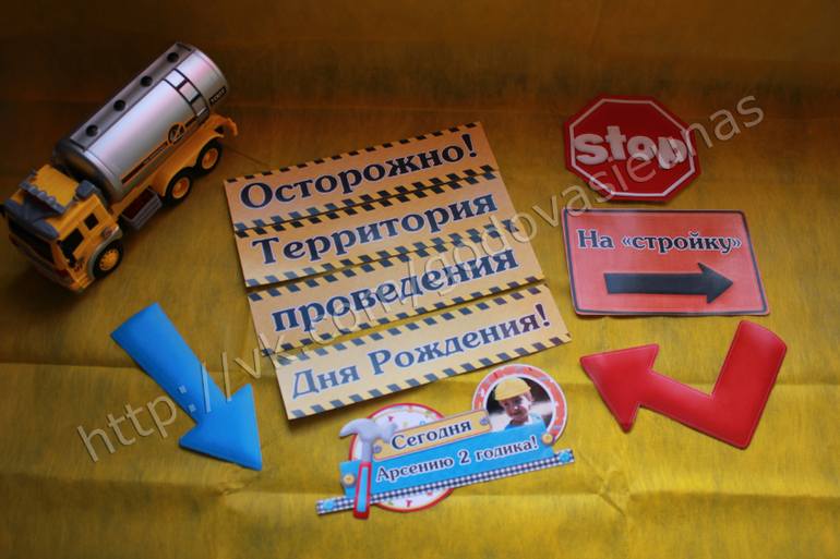 Создайте тематические плакаты, сделав на них надписи «Осторожно! Впереди Вас - груз с весельем», «Будьте аккуратны, ведутся работы на стройке», «Давайте вместе построим веселье!», «Осторожно! Ведутся строительные работы!», «Приступаем к работе!».