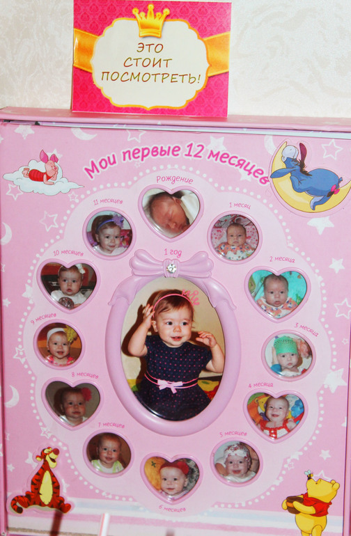 На стене, которую видели гости, при входе в комнату я сделала Настин замок с ее фирменным именным Гербом:) а под замком разместила растяжку из ажурных бодиков "мои 12 месяцев"