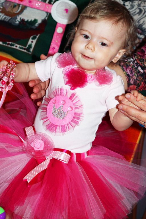 Настин наряд: юбку ту-ту заказывала; бант на юбку делала сама; коронку на голову также заказывала у одной из рукодельниц;бодик украшала сама (купила простой розовый бодик, сделала и наклеила на него розочки и сделала аппликацию КОРОНЫ из страз).