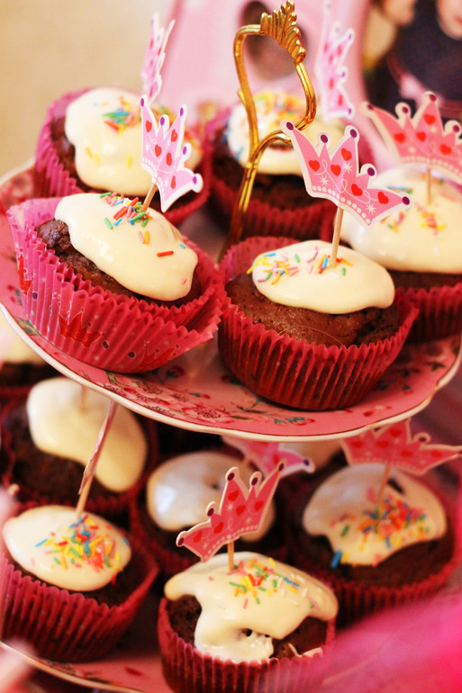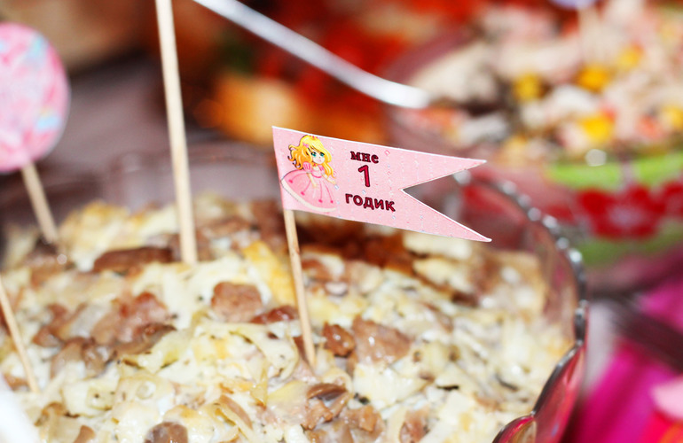А это наш основной стол. тоже гордость. Сделала прекрасные Платьишка-топперы принцессы, которые воткнула в салаты. также много флажков и обычных круглых топперов с картинками принцесс и замков. Оформленное детское-взрослое шампанское. Сделала держатели для салфеток с розочками. И на столе у нас парили прекрасные бабочки (мне их делали на заказ), которые я приклеила к фужерам всех гостей!