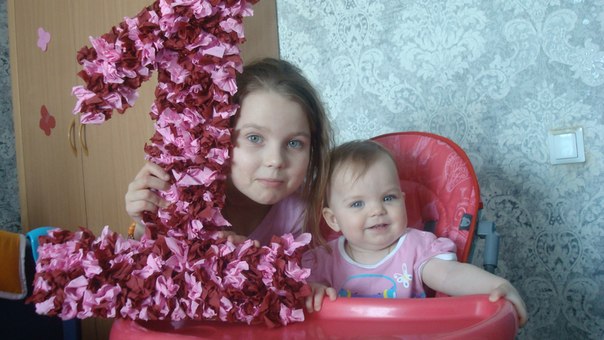 Комнату я украсила растяжкой с днем рождения , шариками обычными и заказал один с али-экспресс и бабочками из гофрбумаги, оставшимися после единички. Ещё сделала рамочки куда вставила фото и . В первое вставила фото 1 дня и годика. Украшать комнату и делать единичку мне помогала старшая дочка.