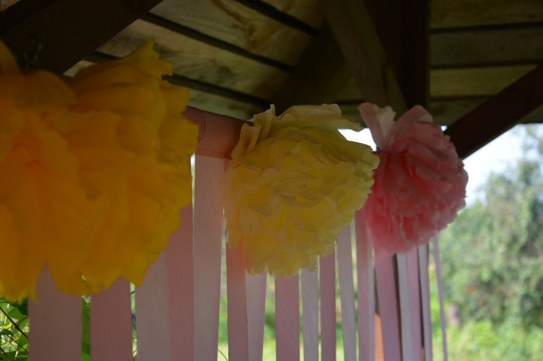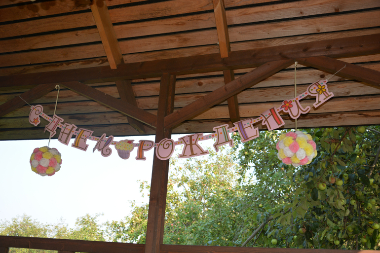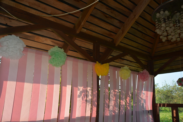 отмечали мы на природе, на своем участке в беседке. украсила как успела, совсем забыли про шарики. так и не надули их)