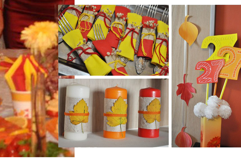 Я для себя делала украшения на осеннюю тематику : делала гирлянды треугольника ми а на ней отпечатки листьев, делала гирлянды из листочков -вырезанные из бумаги, покрашены краской на ленточке, еще на улице папа мне букет собрал осенний -рябина, и веточки с осенними листочками, делала каждому гостю вилок в салфетки с осенним украшением, а внутри были 3 вида картинок: грибок, шишка, рябина -в зависимости от того что попалось -выдавались маленькие презенты, кажется это было 3 вида шоколадок : Марс, твикс, баунти. Если получится фото прикреплю. ..