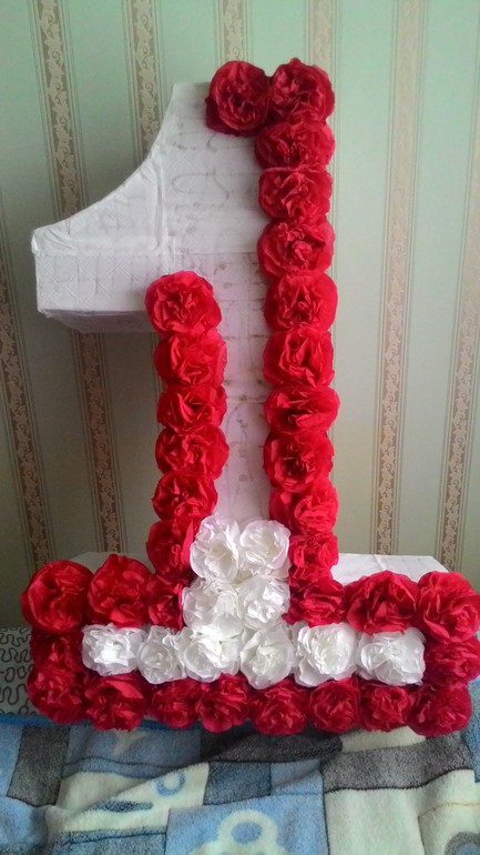 Подготовка к ГодовасиюВсем привет)Вот уже прошло две недели от того дня как мы с мужем начали делать единицу...и вчера я ее закончила!Конечно не без этого чтоб доченька мне не помогла))оторвала уже три розочки,но мама уже отремонтировала))Завтра посчитаю сколько ушло цветов))Сначала я оочень хотела быстро доделать и посмотреть что получиться,потом уже расслабилась))садилась вечерами на 1,5-2 часа.
