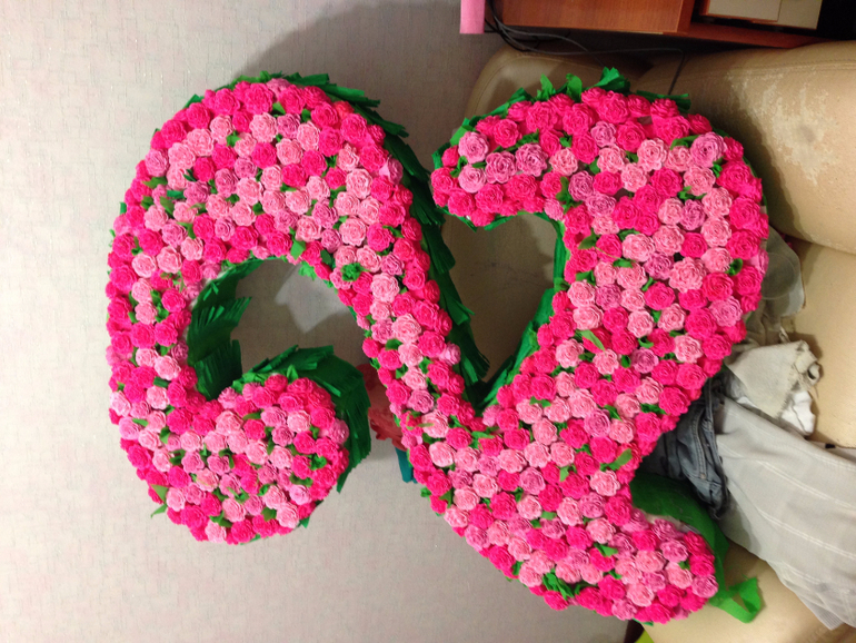 Девочки! Продается очень красивая Двоечка. Делала сама, в течении двух месяцев, конечно не каждый день) За основу использовала гофрокартон, розочки делала из итальянской гофробумаги, на розочки ушло 9 рулонов бумаги. По бокам обклеивала крепбумагой, между розочками тоже ее вставляла. Высота получилось больше метра!