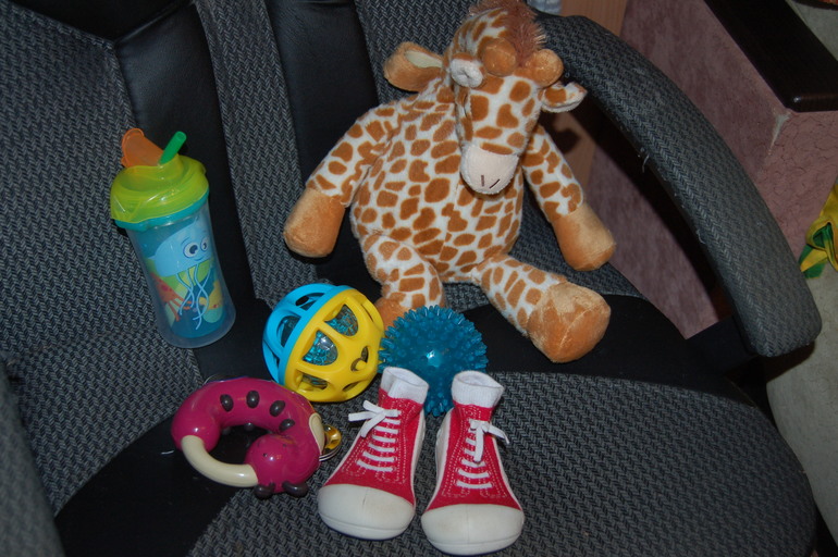 Спательный жирафик, поильник с трубочкой (пользуемся вовсю), два мячика, бубен и супер тапочки (аттипас)