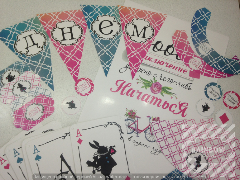 У нас 25 мая, но я уже частично готова....сделала наборчик в стиле "Алиса в стране чудес".....ближе к празднику будет торт и шарики