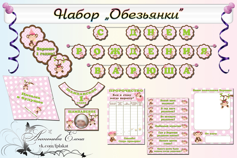 Также набор может быть дополнен любыми элементами в том же стиле (колпачки, обертки для шоколада, этикетки на соки и пюре, фотоплакатом и т.п.)