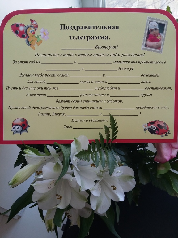 И поздравительную телеграмму, прилагательные вставляли в пустые строчки вместе с гостями, с оборотной стороны фото дочки: