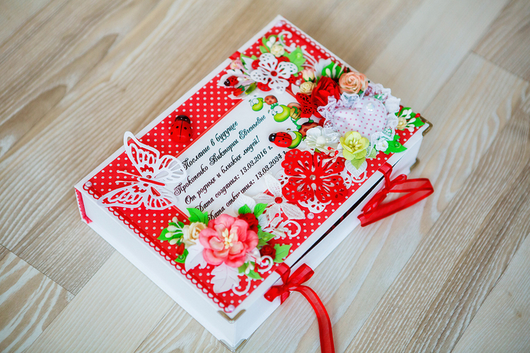 Всё это запечатаем сургучом в краСССивущую коробочку в авторском исполнении ))) от моей Оленьки, красота необыкновенная, даже прятать не хочется и откроем на дочино 18-летие, т.е. в 2034 году. ))) Оцените сами коробочку: