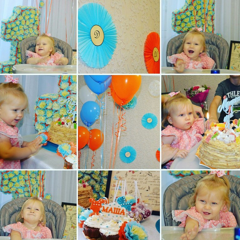 Отмечали др мы дома в кругу семьи, крёстных и их половинок. Готовиться к празднику я начала месяца за два. Но, ввиду своей дурацкой черты готовить в спешке всё в последний момент, подготовка имела вяло-текущий характер. Было решено проводить праздник в оранжево-голубых тонах. Запланировала сделать большую единичку, фильм о первом годе Маши, плакат достижений, наряд в одинаковом стиле, подготовить конкурсы и атрибутику к ним, декор, кэнди бар.