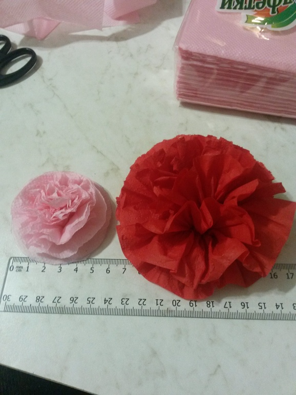Розовую салфетку складываешь в два раза ( помимо того что она уже сложена), потом в серединке степлером и обрезаешь края, делая круг. Можно бахрому сделать покраю. Потом каждый слой, начиная с верхнего поднимаешь и так все, кроме самого нижнего. А красный я тебе сейчас ссыль скину ниже. Там тоже красный цветок.