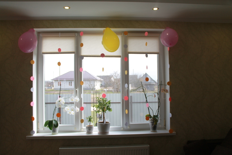 Ещё делала гирлянды из цветных кружочков. В дом мы переехали не так давно, тюлем ещё не обзавелись, поэтому повесила их на окна))) Получилось достаточно мило, даже снимать не хочется))
