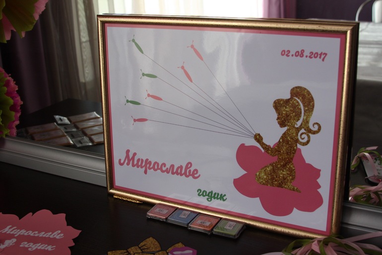 Гостям в подарок я приготовила медали (на обороте были стихи от лица именинницы каждому гостю), шоколадки и магниты в стиле праздника. Так же каждый гость написал нашей крошке послание в будущее (запомнить каждое пожелание Мира не сможет, а вот прочитать в будущем сможет сама).