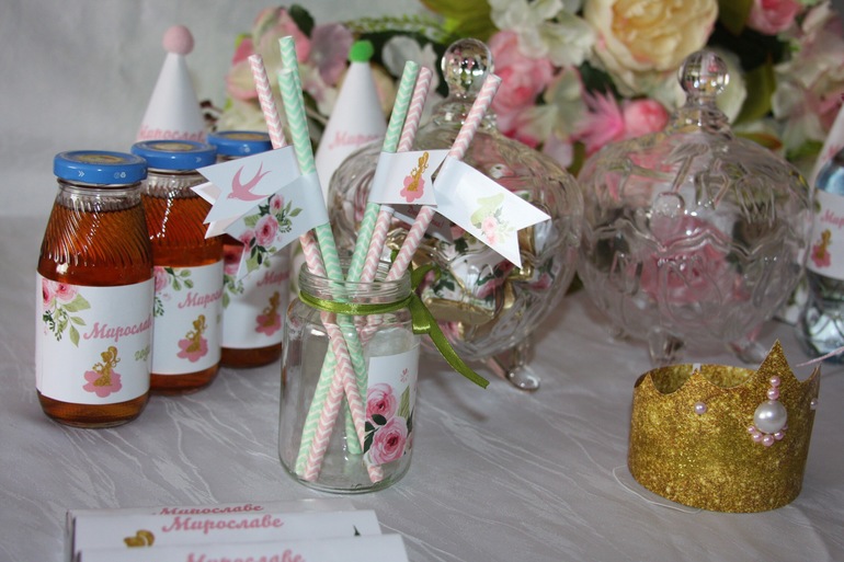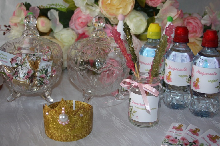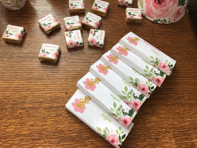 На конфетках буковки "МИРОСЛАВА" на обороте написано качество Миры, начивающееся на эту буковку. Гости выбирали по буковке и читали какая же Мируська у нас ;)