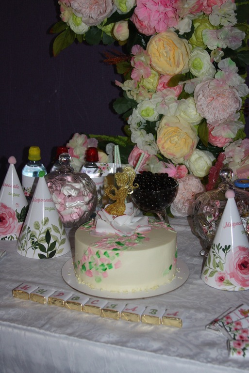 Торт был просто изумительный, долго я терзала нашего кондитера (которая еще не делала сахарные цветы), но цветочек у нее получился чудесный, топпер с Дюймовочкой вписался идеально!