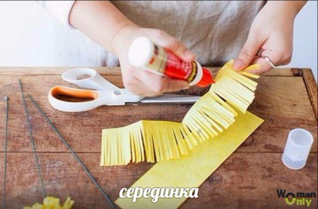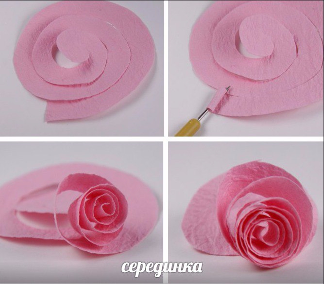 Ну и сердцевинка. Я делала 2 вида - бахромой и спиральные розы. Для фиксации серцевинки к цветку использовала клей - у меня горячий.