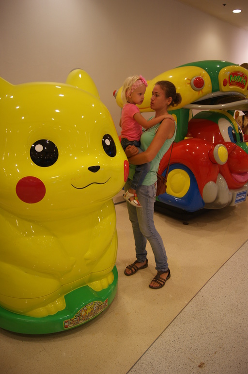 Этого героя Поля не знает.Но старшая в детстве про Пикачу мультик смотрела.Захотела около него сфотографироваться.