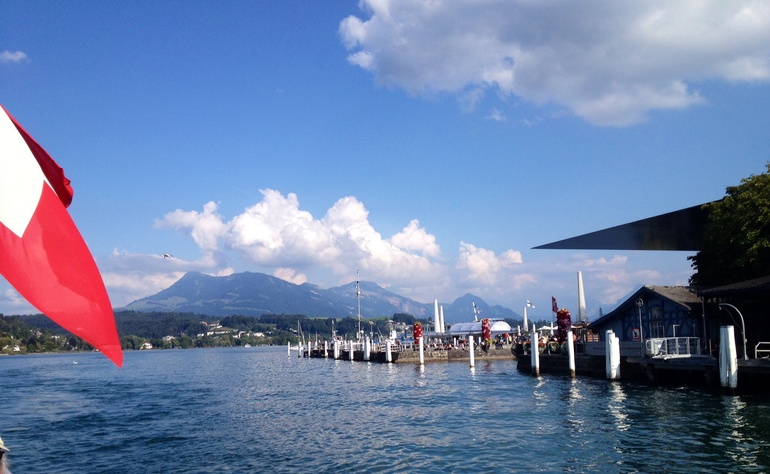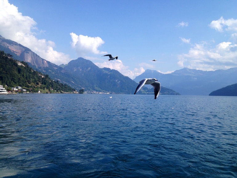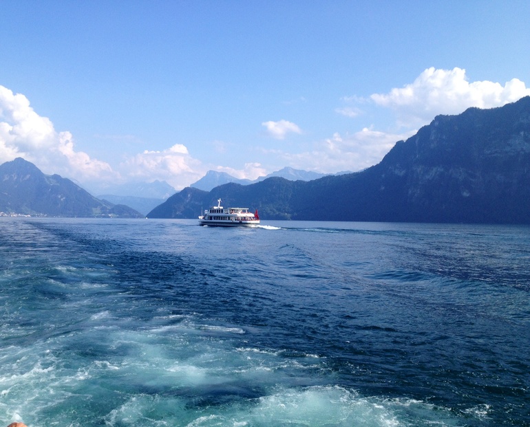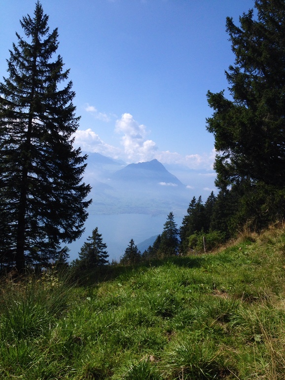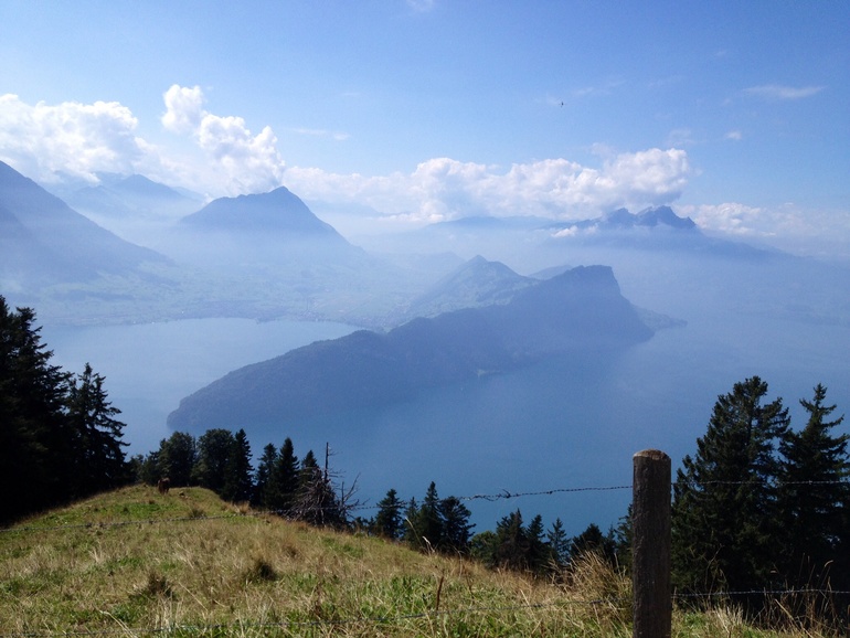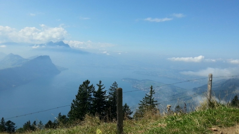 Каждый местный связывает свою страну с этой горой. Причем она ничем таким по высоте не отличается, но на этой горе проводят всякие национальные вещи, типа концертов , горнов и подбрасывания флагов вверх ( национальная забава:-))... Почти каждый побывал на Риги... Ну и мы пошли. Снегом она не была покрыта , поэтому особо стимула у меня не было... Но в горах ( кроме южного Тироля, спасибо Свете из Мюнхена) я еще не была... И короче, дав себе пинок...я отправила дете в сад и бегом на вокзал...( предварительно за месяц купив себе дешевый билет, иначе было бы дешевле за те же деньги слетать в Москву).и вот, в 8.30 я, купив кофе и гипфели ( то, что французы называют круасаном), сижу в поезде Берн-Цюрих ( ехать ровно час без остановок, если рано утром, то как селедка в бочке, 2м классом. первым тоже не сахар. но пол девятого видимо уже не утро, и я сижу между в "купе" с 3 мужиками за 60. один устроил конференцию с кем то по тел., на англ., двое других ехали куда то по делам, в Граубюнден ( города Кур, Санкт Галлен, от нас 3 часа на поезде, для местных это как из Москвы во Владивосток прокатиться) поезд, но видимо не в час пик. Проезд из Берна в Цюрих. 60 мин, стоит 50 уе , вторым классом. это для сравнения. А мне то еще дальше надо, а именно из Цюриха до Арт-Голдау, 40 минут, и вот оно счастье- еду я на чизальпино. Итальянский поезд. Такой классный. мне очень понравилось. Только остановки он не показывал и не объявлял. но у меня все получилось, я вышла где надо, и 15 лет спустя я встретила Настю. И мы пошли искать подъемник на Риги. Наш заранее купленный билет (за 45уе) позволял нам ездить по все стране на чем угодно, в т.ч. и кораблики, и даже включал в себя некоторые подъемники. ( обычно подъемники вообще зашкаливают. как пример, Юнгфрауйох ( кто смог прочитать с первого раза?) стоит 200 уе. но Риги не был покрыт снегами и не уходил за 3-4 тыс метров, и мы доплатили всего чуть чуть. и вот мы на вершине. это первое впечатление, как только мы вылезли из фуникулера.
