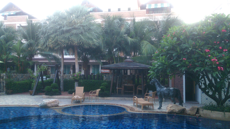 Отель мы выбрали Harmony Inn на улице Тепрая, оттуда можно ходить на пляж Паттайя Парк или ездить на Вонгамат и Джомтьен. Но если ехать в Паттайю на весь отпуск, то я бы выбрала район Наклыа, в пешей доступности от пляжа Вонгамат. С отелем нам снова очень повезло, вроде бы рядом с шумной и проезжей улицей, а возле бассейна тишь и благодать. Даже в последний день Сонграна, когда вокруг был жуткий гомон и кураж, у нас, за углом, было сухо и тихо))))