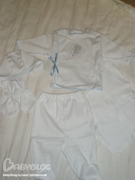 Все было в коробочке. В комплект входили: 2 распашонки, ползунки, чепчик и рукавички