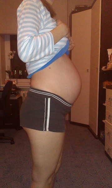 Знакомая картинка живота, как-будто в зеркало смотрю :))) У меня тоже пузико выпуклое вперёд, с боков ничего нет, а со спины даже не видно что я беременная.