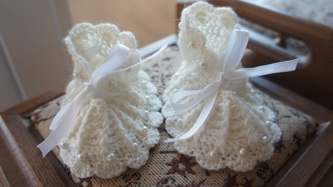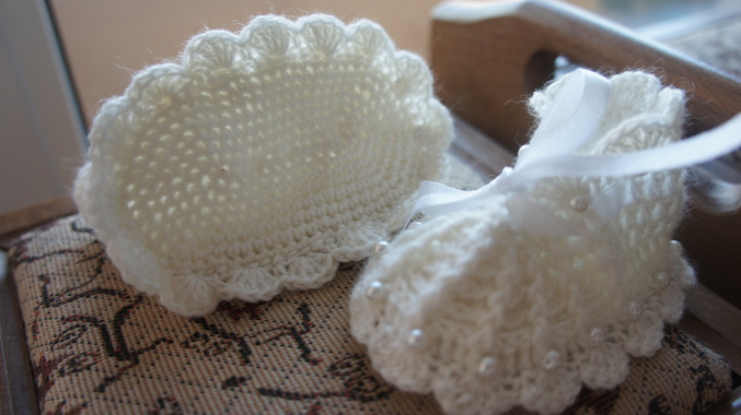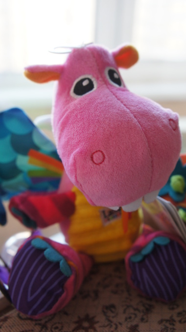 Заезжала к маме сегодня с утра, она мне отдала малявкин радужный плед, который связала и очередное свое творение - пинетки. А я сейчас допришивала к ним бусинки и ленточки придела + сегодня прикупила еще одну чудную игрушку Дракончика, всю шуршащая и гремящая))))Вот:
