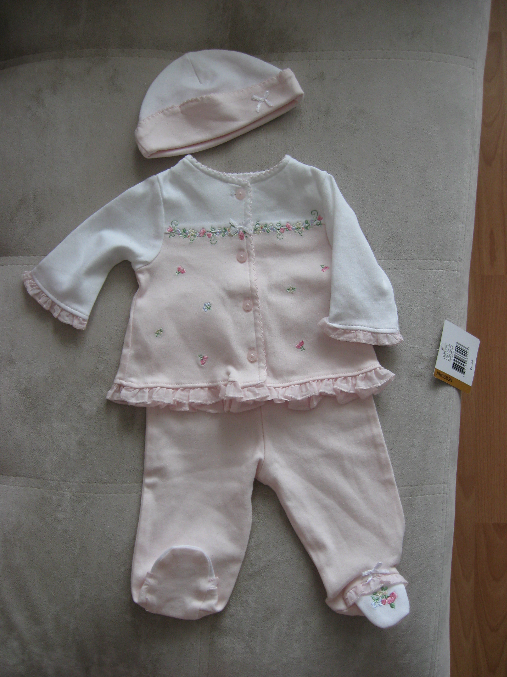 Мучительно долго рыскала по инету в поиках удачного комплекта для малышки. Хотелось купить что-то милое, девчачье. И я нашла вот такой комплектик. Он малюсенький, мягкий, нежный! Папе останется купить одеяло-конверт (или плед) и ленточку)