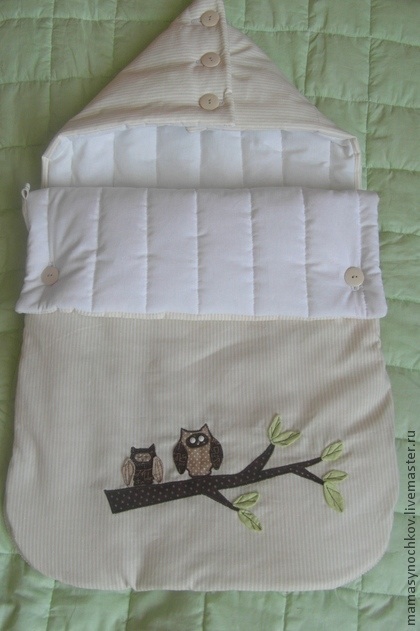 Мне шьют на заказ на выписку в начале сентября-конце августа (ПДР на 10 сентября, но мало ли, не дохожу) вот такой конвертик. Только пуговки будут коричневые, а вместо сов - аист с малышом. Внутри будет синтепон 1см, чтобы держал форму. Без конверта боюсь давать мужу в руки, поэтому он будет. Вниз очень тонкий слипик и чепчик. В машине кондиционер. думаю, не зажарится. Да и неизвестно, какая именно погода будет. Вполне может быть и дождь и холод...