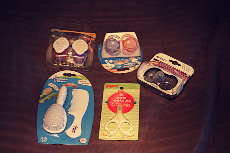 Это 2 пустышки-вишенки и клипсы для них, расческа и щеточка для волос, ножницы, и накладки для груди (на всякий случай взяла).