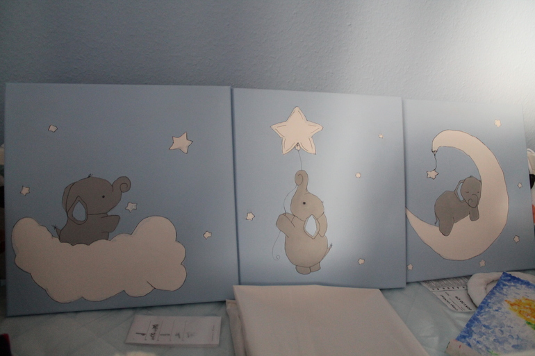 Пустовала у нас одна стена в детской, и в интернете я в одном из блогов нашла замечательные картинки слоников и они мне очень понравились (только они на розовом фоне были)-я решила поповторять и вот, что у меня получилось)))