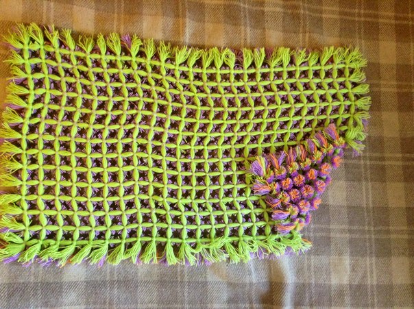 Одежда, игрушки, техникаТолько что закончила. Делали всей семьей. Папа изготовил станину, девчонки помогали плести и разрезать помпошки.