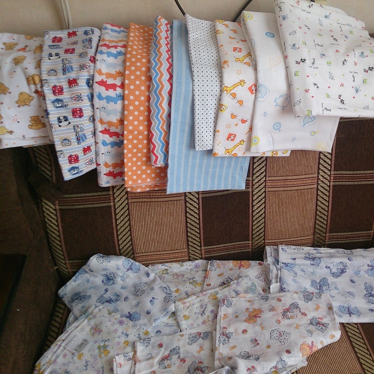 Одежда, игрушки, техникаИскала долго расцветки,которые понравятся.В итоге получилось 8 фланелевых,2 трикотажных и 10 ситцевых.Пеленать не собираюсь,но пеленок много не бывает!)