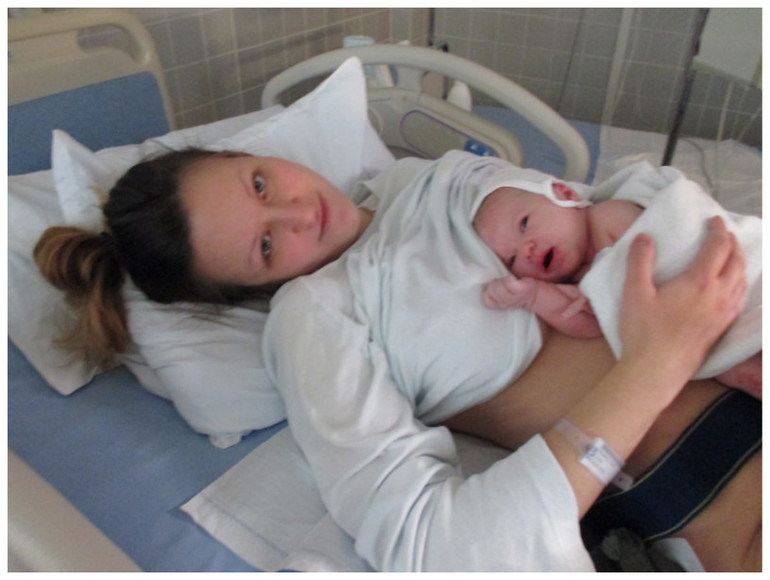 В 10.15 решили посмотреть раскрытие, я сползла с кровати, чтобы сходить в туалет и тут из меня потекло. Отошли воды, были они коричневатые( В 10.25 меня уже искололи иголками и ввели антибиотик от стрептококка (вводить его нужно каждые 4 часа, и теперь время стало работать против меня. родить мне надо было в течении следующих 12 часов). Посмотрели раскрытие, а они всё такое же как в 4 часа утра, всего 1.5 пальца. Я была в шоке, столько времени прошло, боль сильная (хотя терпимая) и никаких перемен. Меня подключили к КТГ и сказали, что надо полежать, а это было почти нереально. Тут пришла врач (роды в Финляндии принимает акушерка, они, кстати, менялись постоянно, пересменка и т.д.. Последняя, которая принимала роды, говорила со мной уже по английски, что меня радовало, т.к. не надо было искать слова и напрягать мозг), которая меня приятно порадовала, врач оказалась русской! Моему удивлению не было предела, на секунду я даже забыла, что рожаю и жадно слушала родную речь). Врач сказала, что, т.к. раскрытие идёт плохо, поэтому будем вводить окситоцин для того, чтобы ускорить процесс. Но сначала ждём раскрытия в 2 пальца и ставим эпидуральную анестезию, если я согласна. Я была уже согласна на всё, и продолжила ждать нужного раскрытия. Спасал массаж мужа и грелка. Газ попробовала, но при первом же вдохе меня начала мутить и от этой трубки я отказалась.