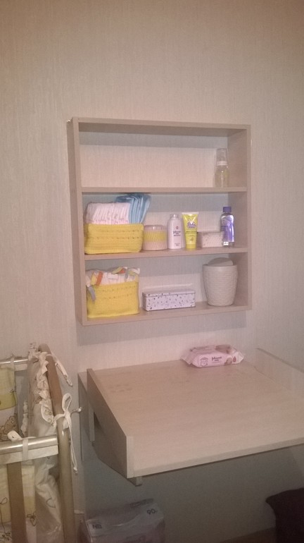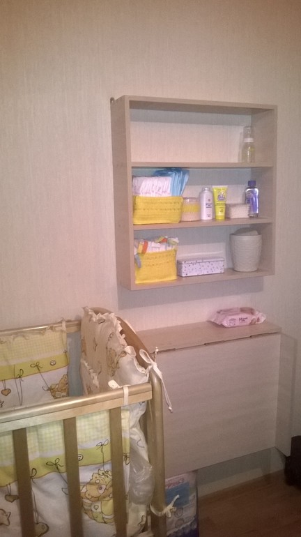 В силу небольшого пространства в нашей спальне и наличия уже достаточно вместительного, но обычного комода, я начала поиски альтернатив для пеленального столика. Найдя в интернете красивые откидные столики с нереальными по нашему карману ценами и неизвестными заграничными магазинами, на семейном совете решили сделать сами. Спасибо любимому мужу за то, что поддержал мою идею - продумал и воплотил ее в жизнь! Отмечу, собирая столик, он пищал как мальчишка, собирающий новенький конструктор))))) Ну а вот и он: в собранном виде -