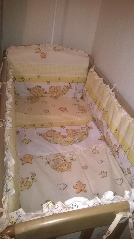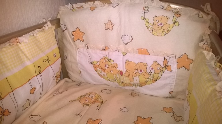 Имея у мамы швейную машинку и руки откуда надо - решили бортики и комплект в кроватку пошить самостоятельно: долго искали ткань, уж хотелось мне чего-нибудь нейтрального. Вот, что получилось: