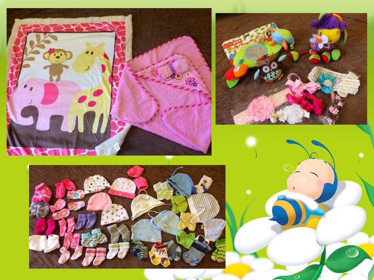Одеялко, полотенце, игрушки и акссесуарчики, и вещи по мелочи (новые и от сына- это видно)) - знаю, что все не переносим)