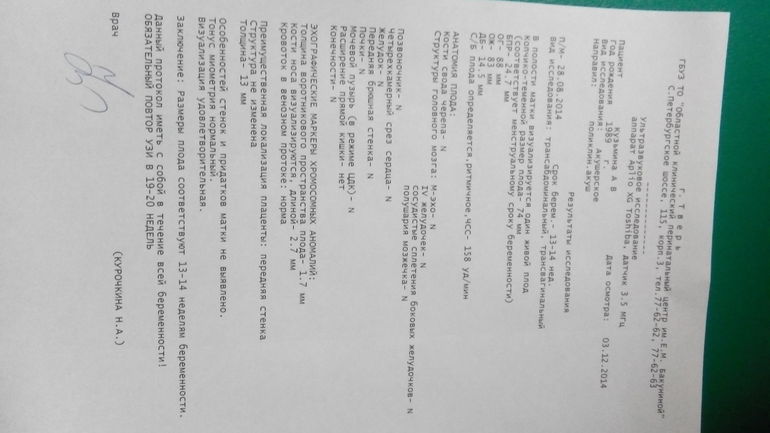 Поехала я сегодня в Тверь в перинатальной центр,сначала направили меня вэк гинекологу-акушеру,она отправила на УЗИ а потом к генетику...так вот сходила я на узи ,все посмотрели и врач сказала,что по УЗИ не вижу н каких отклонений,все как и должно быть у здорового ребеночка..Но УЗИ не даёт полную гарантию того,что все в порядке,нужно ехать в Москву и сдавать..забыла как называется,вообщем через живот трубочкой берут кусочек плаценты и тогда все точно будет ясно...тоже самое сказала и генетик...сказала если я успею на 13-14 неделе то вообще супер и анализы быстро придут,если не успею то потом можно делать только с 17-19 недели и результата анализов ждать 3 недели...говорит в меня 1-1,5 недели есть...по скринингу сказала,что риск есть и если я хочу точно знать здоров ли ребёнок,то ехать обязательно в Москву,никакое супер супер УЗИ точно не скажет что с ребёнком.... Записалась я на понедельник сначала на консультацию к гинекологу,потом нужно будет к генетику и он решит когда делать эту процедуру с плацентой и стоит ли вообще...ой,я вся измоталась! Нервы писец,давление повышенное...как ехать в Москву?я там ни разу не была!с метро вообще не дружу..не прокатать бы день впустую...