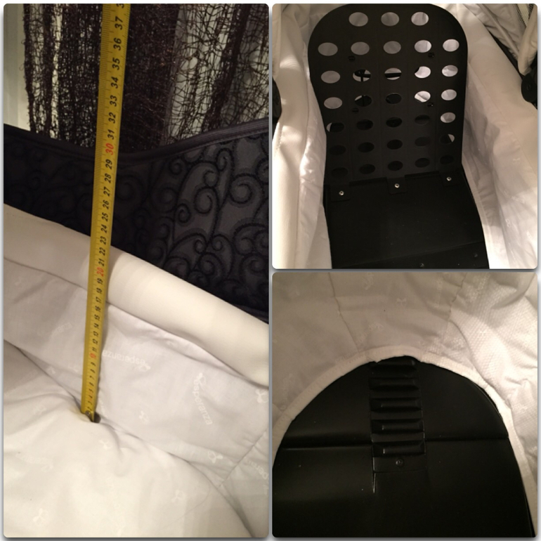 Удивлена, но материал люльки, просто нежнейший хлопок..очень мне понравился. Обивка снимается. Устанавливается легко, после того когда разобралась как..))) Огромный капюшон, внутренняя часть вытаскивается и почти полностью закрывает малыша, что может пригодится в солнечную или ветренную погоду. Кап опускается нажатием кнопок, они не очень удобные показались, но бесшумно. Размеры 38х23х80 (заявлены немного больше..) Есть регулировка спинки в 4-х положениях. Ручка и белые вставки эко кожа, в люльке можно качать, есть полозья. Накидка для люльки, защитит от ветра, но на мой взгляд больше летняя если сравнить с чехлом на ножки от прогулки.