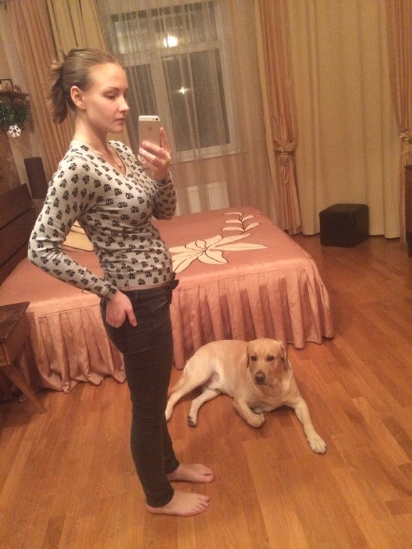Женя! Беременная! Жень, ну конечно видно что ты беременна, а не толстая! Ну какая же ты толстая!? у тебя личико худенькое, ножки, ручки стройненькие. Давай набирай еще! Булешь хорошеть не по дням, а по часам)) В общем, ты супер беременная красотка! И собака, такая клёвая собака у вас. Как твое самочувствие?