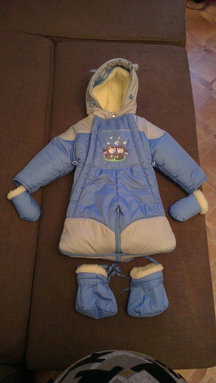 У нас подобный, но розовый у дочи, размер 80, купили ужеипосле выписки правда на прогулки, но честно пожалела что не на выписку взяли, удобнее намного и ничего не утонет, носили с ноября по апрель(отстегнули уже овчинку)и с октября по январь